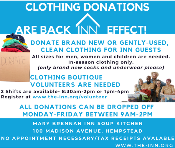 The INN operates the Mary Brennan INN soup kitchen, the largest soup kitchen on Long Island where over 200,000 meals are served annually. You can help us by hosting a food drive in your community of non-perishable, shelf-stable food items.